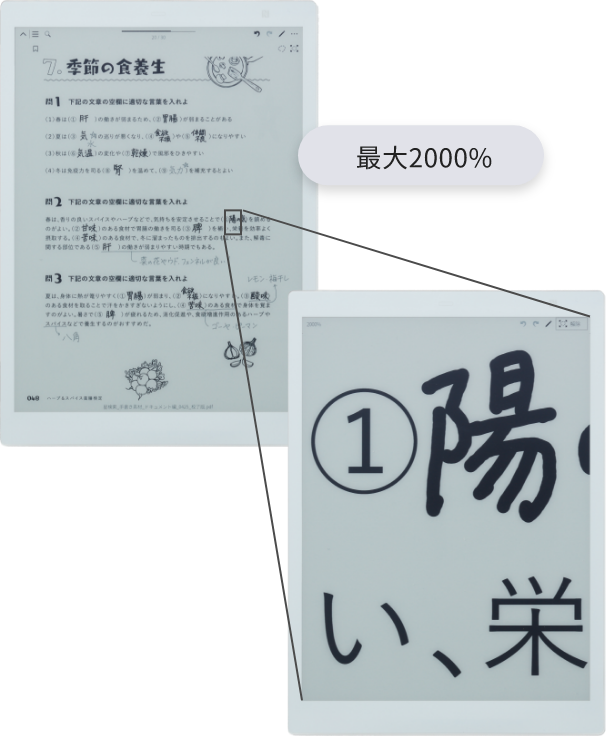 E Ink の最新ディスプレイはコントラストが高く、文字がくっきりと表示されるのが特徴です。また、スマートフォンのようなタッチ操作も可能。拡大、ページ送りなど、直感的に操作することができます。