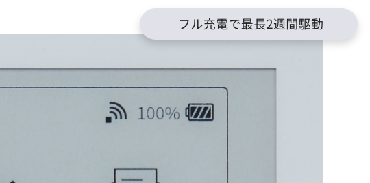 フル充電状態なら最長2週間利用可能※。バッテリー残量がパーセンテージ数値で表示され、確認も容易。長期出張などでも安心です。