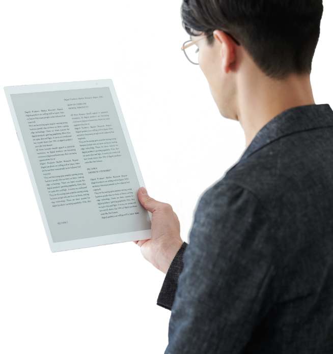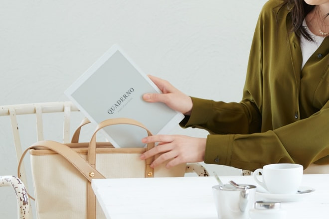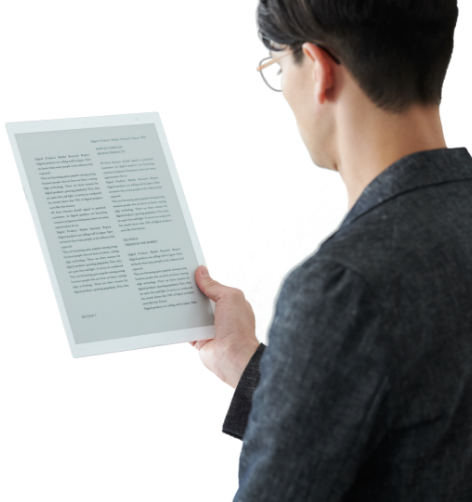 電子ペーパーを搭載した「クアデルノ」は、消費電力の少なさも大きなメリット。液晶ディスプレイと異なり、画面を表示している状態ではほぼ電力消費がなく、とにかく長もち。バッテリー残量を気にせず使えます。