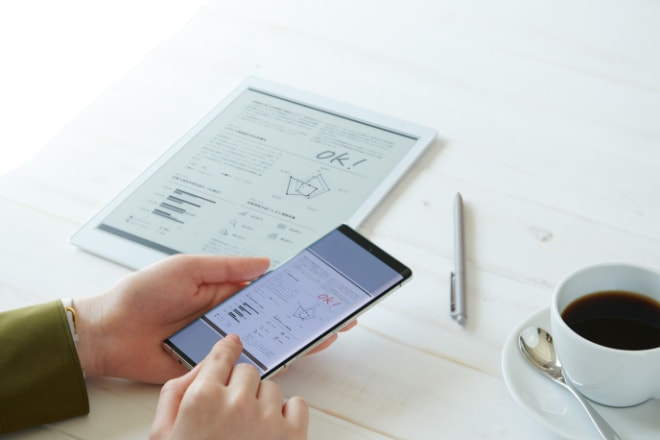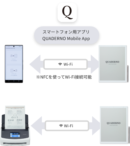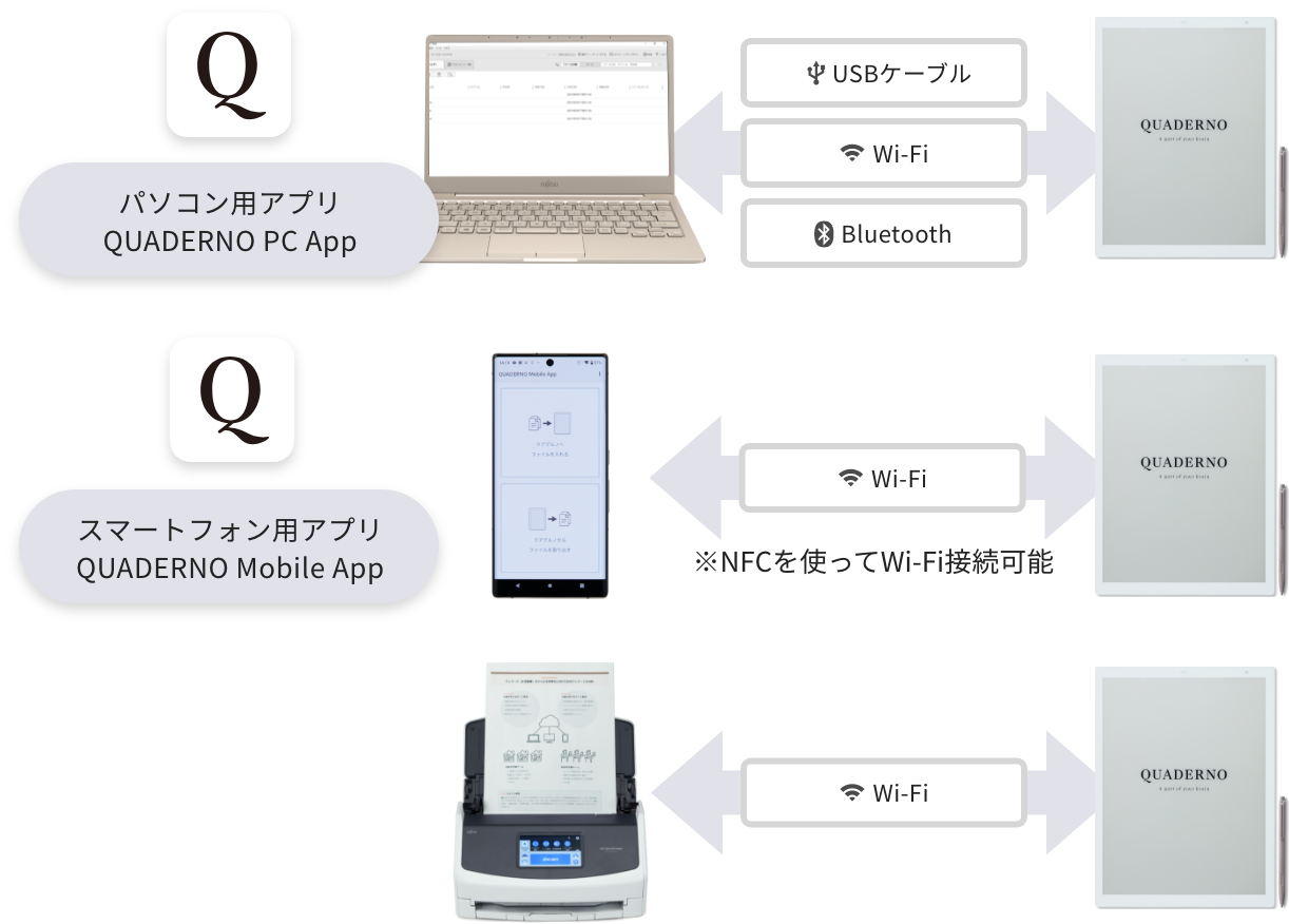 スマートフォンと「クアデルノ」でファイルを送受信できます。パソコンがなくても転送できます。