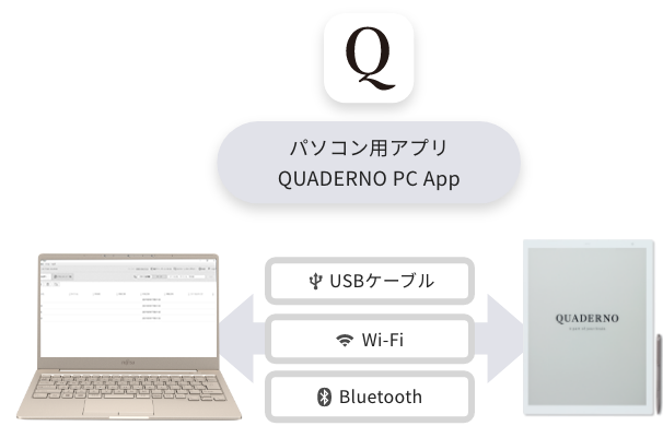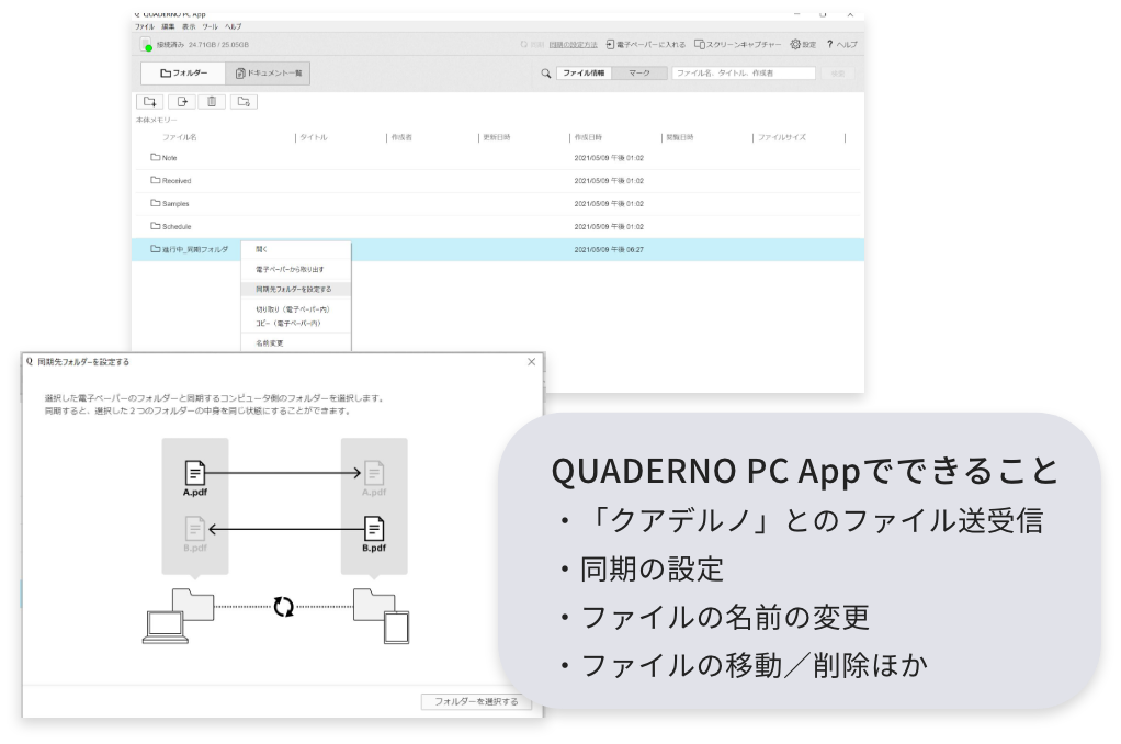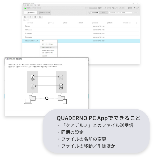 「QUADERNO PC App」で任意のフォルダを同期設定すれば、「クアデルノ」とファイルの同期が可能です。
