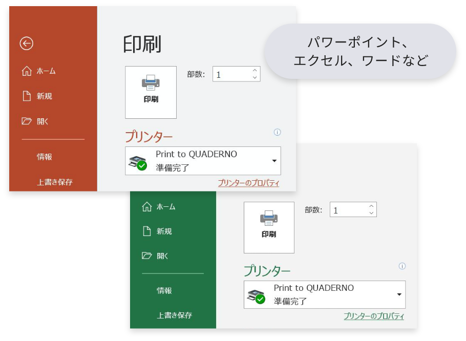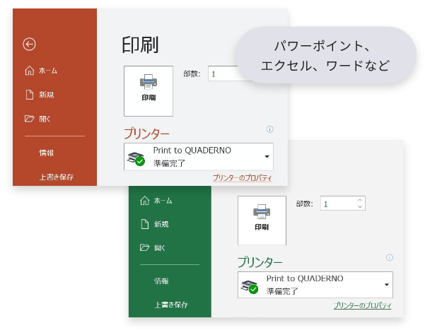 パソコンとつなげば、印刷機能による書類転送が可能。エクセルなども自動でPDFに変換され、クアデルノに転送されます。プリンターに印刷する感覚で「クアデルノ」に資料を入れられます。