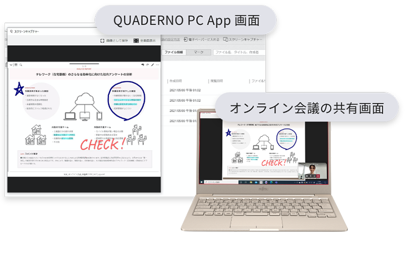 スクリーンキャプチャー機能を使えば、「クアデルノ」の画面を共有可能。例えばオンライン会議では、手書きメモを書き込んだ資料などをメンバーに見せることができます。