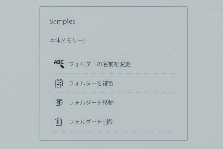クアデルノPCアプリを介さずに本体上でフォルダーやファイルの管理ができます。新たに、フォルダー管理は「複製」「移動」、ファイル管理は「移動」がそれぞれ追加されました。