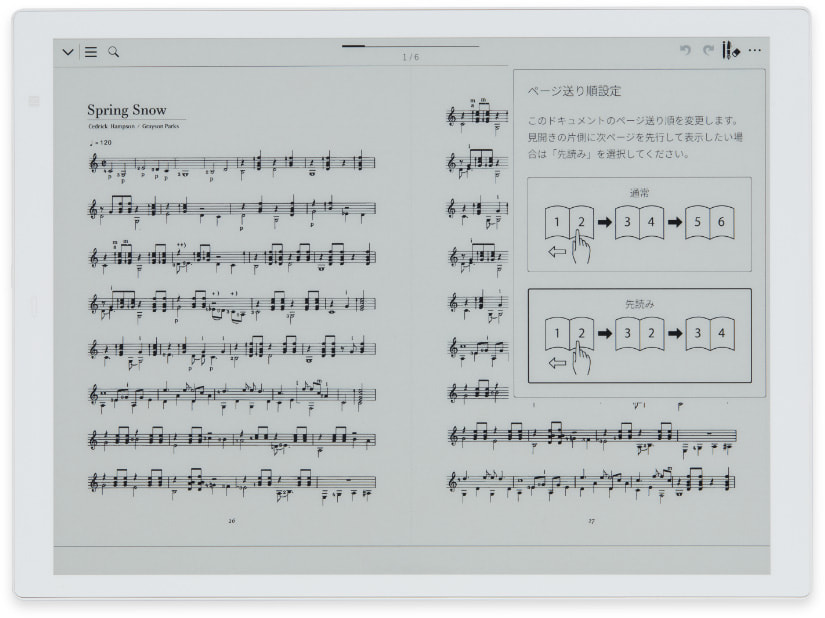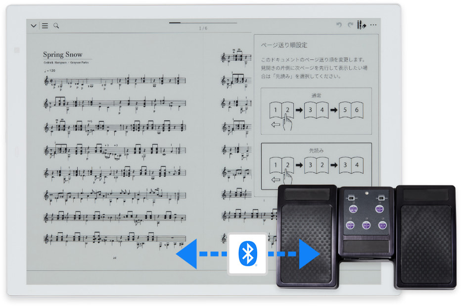 Bluetooth接続フットペダルによる「ページめくり」に対応しました。演奏中に楽器から手を離すことなく楽譜のページめくりが可能となります。また、演奏中の「少し先のページを確認したい」というニーズに対応した「先読み」機能を搭載。デジタルならではの便利機能です。