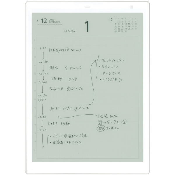 「クアデルノ」には、年間のスケジューラーが用意されている。マンスリー/ウィークリー/デイリーとシームレスに行き来でき、スケジュールやタスクの管理も手帳同様に視覚的に行える。様々なノートや手帳、メモ帳などを「クアデルノ」に集約することができるので、ミニマムな環境でのテレワークを実現できる。