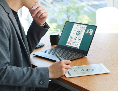 「プレゼン中にパソコンでメモを取る方もいますが、僕は資料に直接書き込みたい派。そのほうが何に対するメモなのかが分かりやすく、“○ページ目のこの部分ですが……”とスムーズに質問できるからです。オンライン会議では、事前に資料のデータを共有していただき『クアデルノ』に入れて書き込んでいます。自分がプレゼンをするときも同様に、用意した資料を『クアデルノ』に取り込んで、クライアントからの指摘を書き込みます。そして打ち合わせが終わったら、資料作成を担当している社内のスタッフに共有。書き込みを元に資料を修正してもらうんです。手書きができるので図や表を書いて指示を出すこともできます。『クアデルノ』を導入することで指示出しの精度と速度が上がったので、その日のうちに、クライアントに修正データを共有するのが当たり前になりました。テレワークの導入により遠隔で指示を出す機会が増えた人には、ぜひ『クアデルノ』を試していただきたいですね」