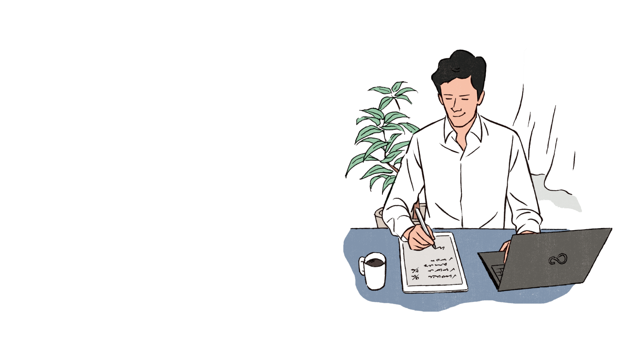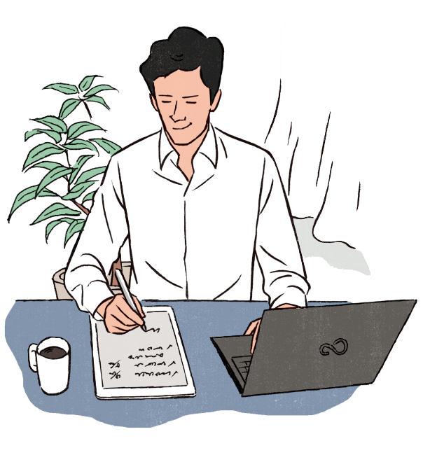 「紙のノートでアイデア出しをしていたころは、すぐに白紙のページを開けないのがストレスでした。ページを開いている間にアイデアを忘れてしまうかもしれませんから。その点『クアデルノ』なら、新しいページを開いた状態でスリープモードにしておけるので、瞬時に起動させてすぐに書き出せます。書き出しスピードが上がりメモを取ることへのハードルも下がったので、紙のノートを使っていたころよりもアイデアをたくさん書き留めるようになりました。また、僕の殴り書きの速度にしっかりついてきてくれるところも気に入っています。これまでも何度か電子ノートの購入を検討してきたのですが、反応が鈍く僕の筆記速度についてこられない製品ばかりでした。その点『クアデルノ』なら、急いで書いても問題なし。アイデアを逃さずキャッチしてくれるから、安心して任せられるんです」