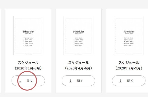 ①下記の「スケジュール」のテンプレートから、好みのテンプレートを選んで[ 開く]ボタンを押して表示します。内容を確認後、ダウンロードしてパソコン内の任意の場所に保存します。