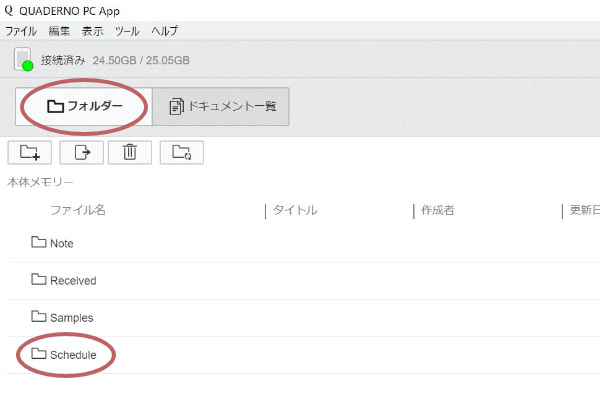 ②「クアデルノ」専用PCアプリ「QUADERNO PC App」を起動します。初期画面から[フォルダー]をクリックして[Schedule]フォルダーを開き、ダウンロードしたスケジュールをドラッグ&ドロップします。
