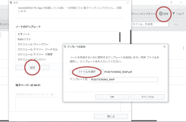 「クアデルノ」専用パソコンアプリ「QUADERNO PC App」を起動。「設定」→「ノートのテンプレート」で「追加」→ファイルを選択。ダウンロードしたテンプレートを選択→「OK」ボタンで登録が完了します。