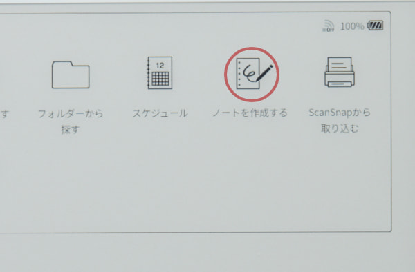「クアデルノ」本体のホームボタンを押し、ホームメニューの「ノートを作成する」をタップ。パソコンで登録したテンプレートを選択してノートを作成します。