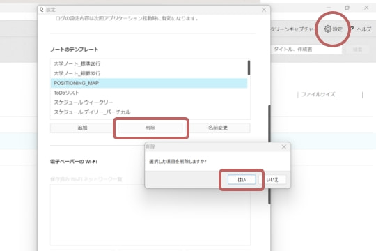 「クアデルノ」専用パソコンアプリ「QUADERNO PC App」を起動。「設定」→「ノートのテンプレート」でファイルを選択→「削除」→「はい」で削除が完了します。