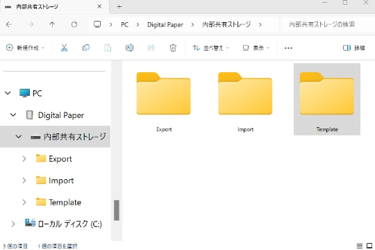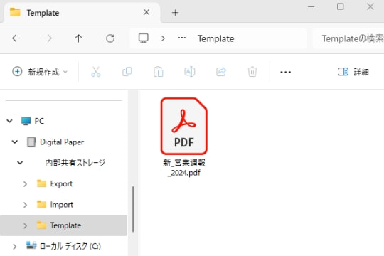 「クアデルノ」付属のUSBケーブルで「クアデルノ」とパソコンを接続。パソコンでエクスプローラーを起動し「PC」→「Digital Paper」→「内部共有ストレージ」→「Template」フォルダーの順にクリックします。