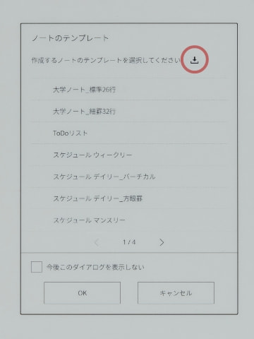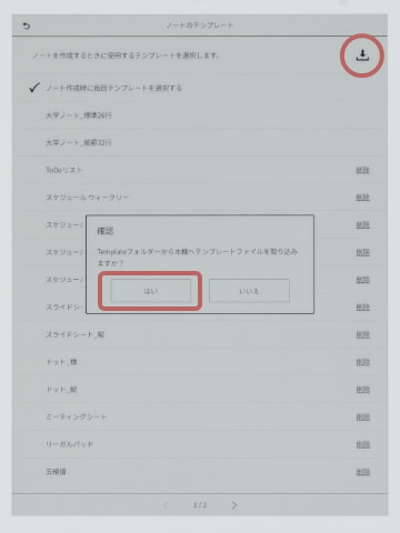 登録方法② 「ホームボタン」→「設定」→「本体設定」→「ノートのテンプレート」を表示。画面右上の「↓」マークをタップして、確認メッセージが表示されたら「はい」をタップで登録が完了します。