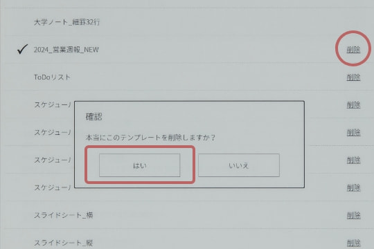 削除方法: 「ホームボタン」→「設定」→「本体設定」→「ノートのテンプレート」を表示。削除したい「テンプレート名」の右側にある「削除」をタップ。確認のメッセージが表示されたら「はい」をタップすると削除されます。