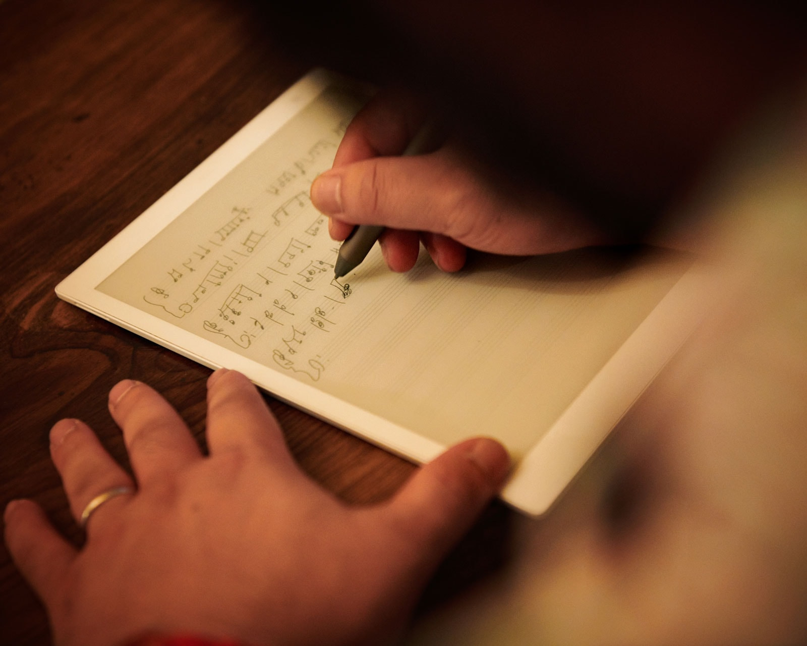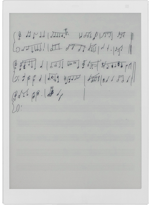 ↑商談のときには、「クアデルノ」の公式HP内の「フリーコンテンツ」からダウンロードした五線譜を使う。「いまのお話でこんなメロディーが浮かんできました」と適当な音符を書けば、あっという間に奇才が完成。そんな演出も彼の営業テクニックだ。気づけば今日もクライアントと握手している