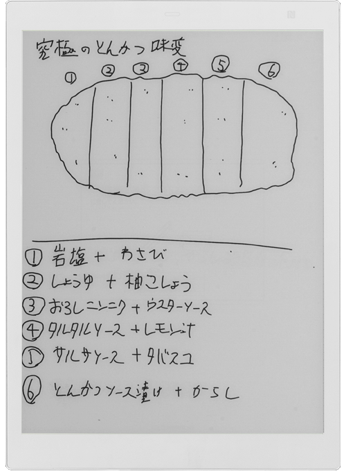 ↑絵や図を交えながら企画を固めていく。「とんかつのパフォーマンスを最大限まで引き出すための調味料」という企画では、書いている内に「ひと切れに2種類の調味料を組み合わせる」や「ひと切れごとに異なる国の調味料を選ぶ」など、斬新かつマッシブなアイデアが画面いっぱいに広がった