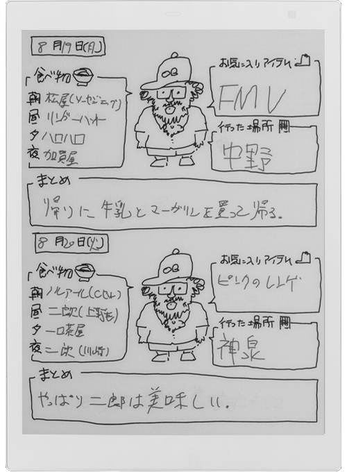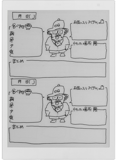 ↑「クアデルノ」に手書きした日記用のテンプレート。専用アプリでデータをPCに書き出し、できたPDFを一度JPG化した後に、再度PDFに変換するとノート用のテンプレートとして登録できる。そうするとノートを新規作成する際にテンプレートとして選べる