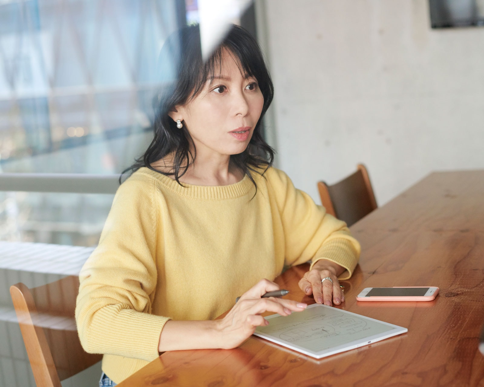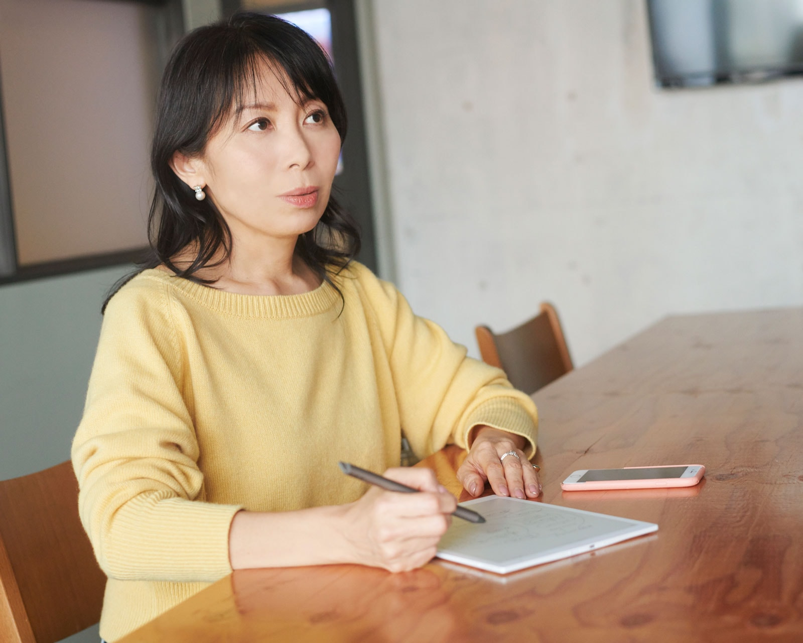 ↑大嶋さんは、著作の部数が累計30万部を超えるベストセラー作家でもある。そのため、書籍のテーマになりそうなワードが会話に出たときに、すかさずメモをとるのが習慣。「クアデルノ」なら起動が速いため、紙のノート同様にすぐ書き出せ、書きもらさずに済む