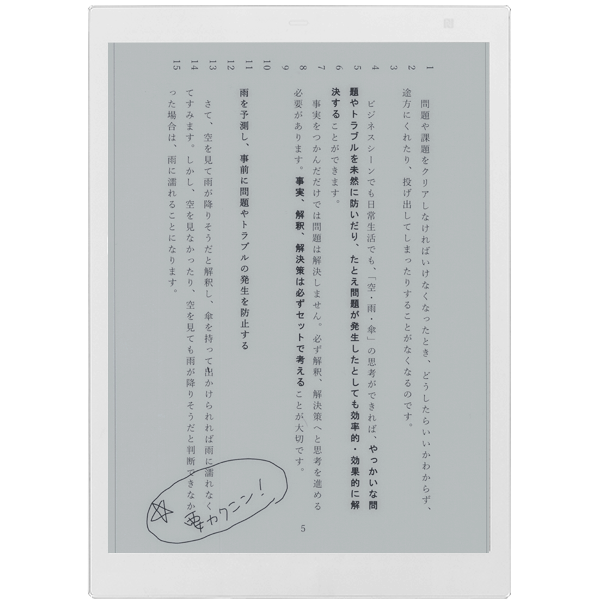 ↑これまでは書籍の原稿を確認する際、書籍一冊分を紙に出力していたため、重すぎて持ち運べなかった。その点「クアデルノ」なら何ページあっても軽い。また、時間をおいて再度読み直したい箇所などを「マーク検索機能」で簡単に探せるのも便利だ