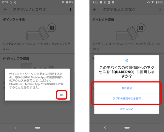 (Nマーク)の無いスマートフォンをご使用の場合は、アンテナの位置をスマートフォンの取扱説明書でご確認ください。- 一部のAndroid端末ではQUADERNO Mobail Appの位置情報へのアクセス許可を確認するメッセージが表示される場合があります。メッセージが表示された場合は「OK」をタップし、続けて表示される画面で位置情報へのアクセスを許可してください。(クアデルノと接続するためには位置情報へのアクセス許可が必要です)