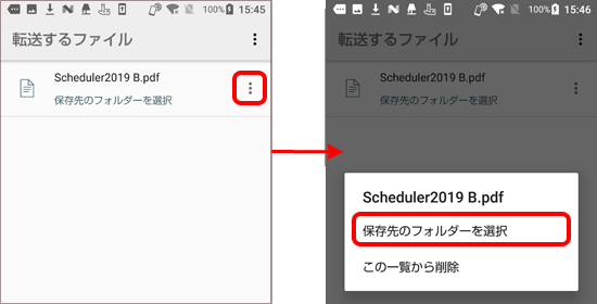 ここでは、1ファイルを転送する手順を説明します。Androidの場合は、複数まとめて転送できます。詳しくは「ドキュメントをまとめて転送する」をご覧ください。