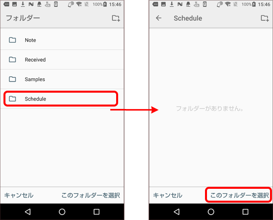 - 表示されたフォルダー一覧から、保存したいフォルダーをタップすると選択したフォルダを表示します。[このフォルダーを選択]をタップすると保存先のフォルダーが選択されます。