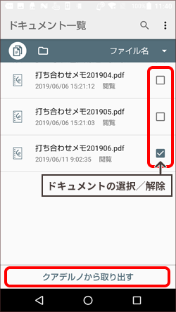 QUADERNO Mobile Appの「ドキュメント一覧」でクアデルノから取り出したいドキュメントを選択し、[クアデルノから取り出す]をタップする。