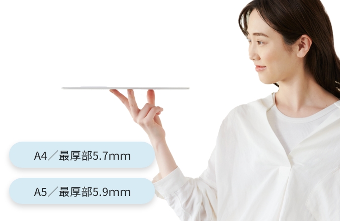 その薄さが「クアデルノ」最大の特徴。最厚部は両サイズとも6mm以下で、一般的な紙のノートと同等です。