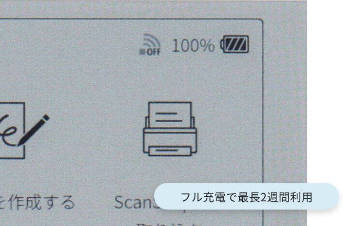 フル充電状態なら最長2週間利用可能※。バッテリー残量がパーセンテージ数値で表示され、確認もかんたん。長期出張などでも安心です。