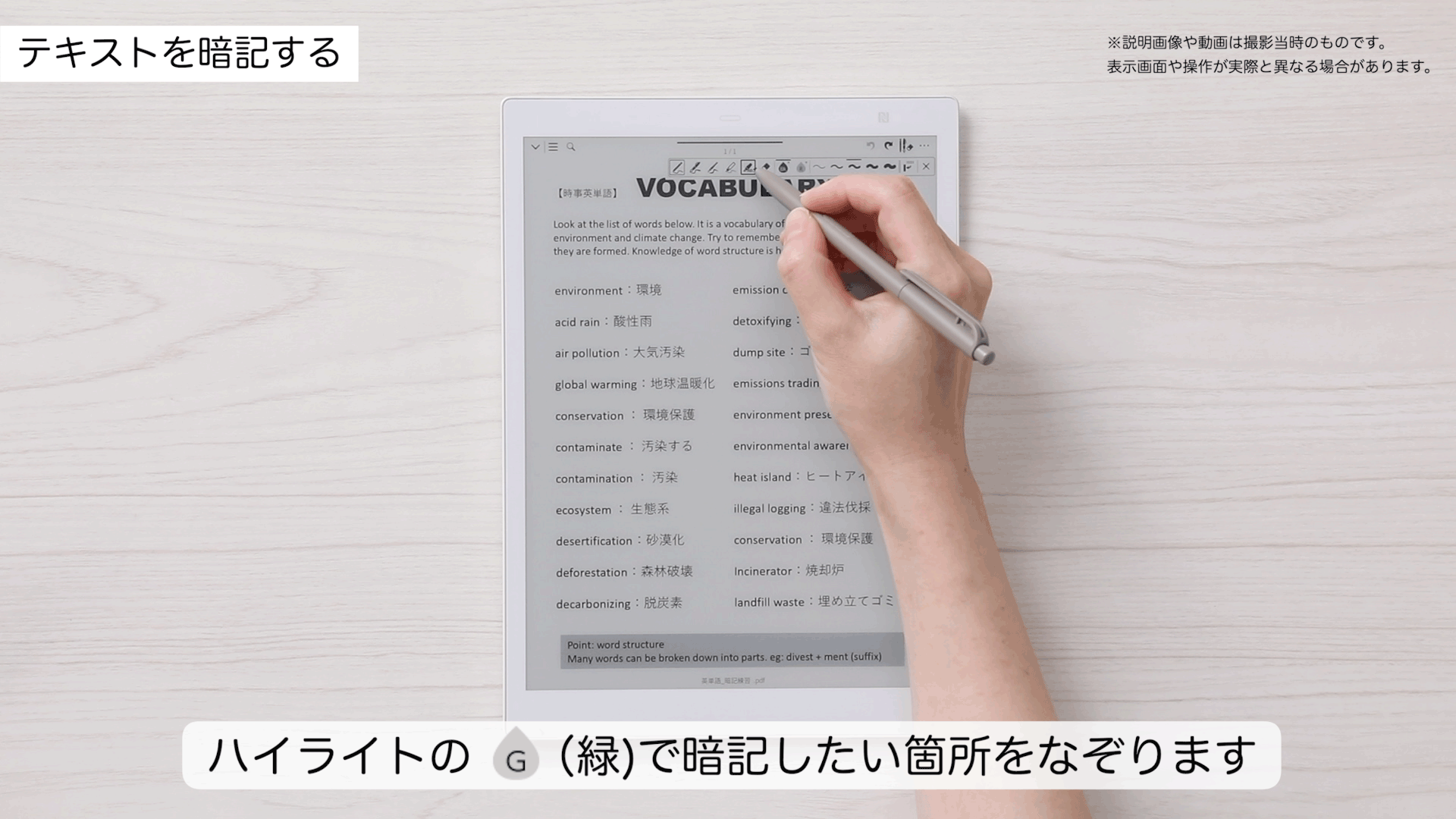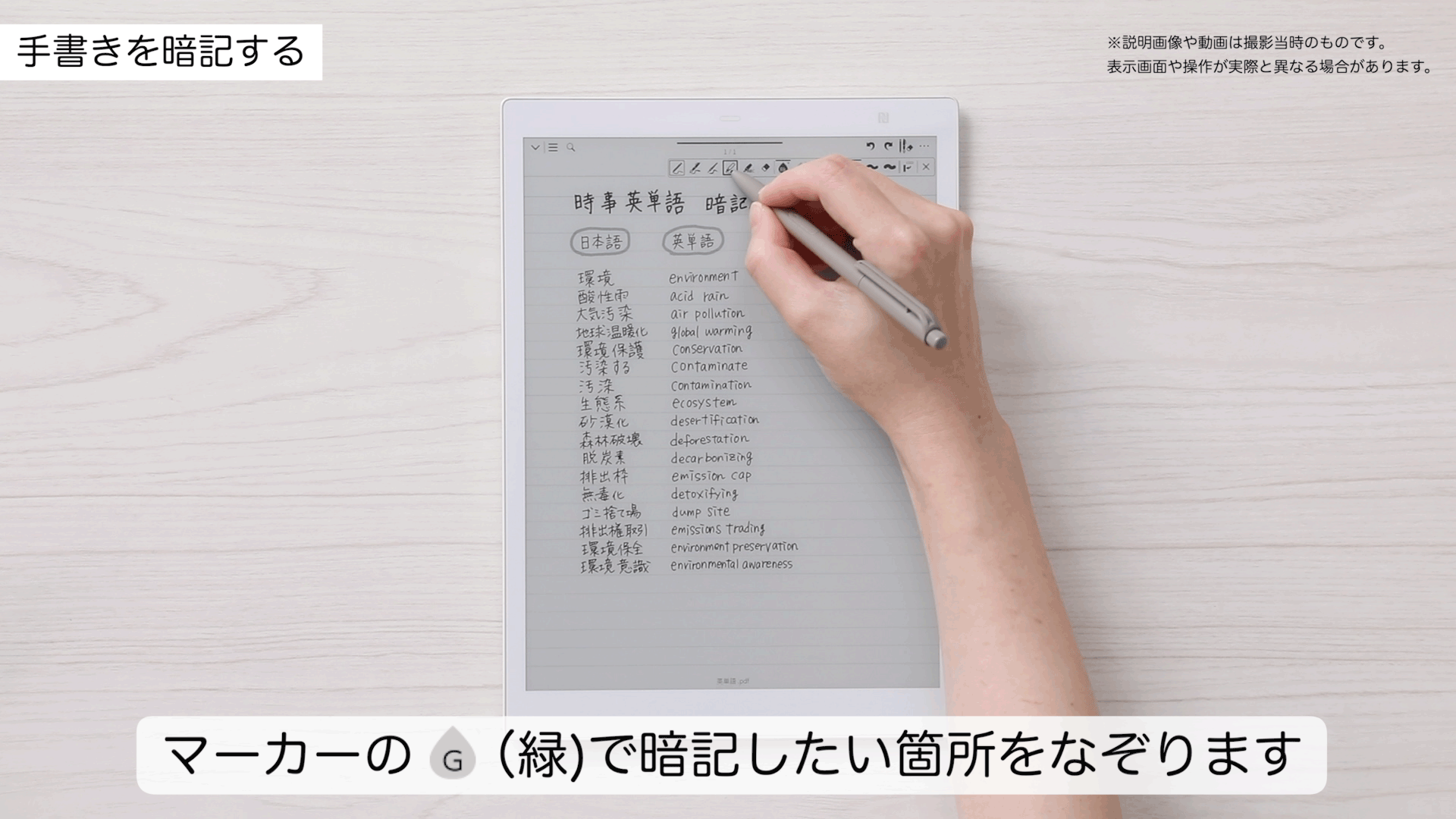 薄型・軽量で、手書きができる「クアデルノ」は勉強での利用にも最適。教科書とノートを兼ねることができるなど、効率的に語学や資格などの学習が可能です。さらに、新搭載の「暗記モード」を使えば、いつでもどこでもスマートに暗記学習をすることができます。