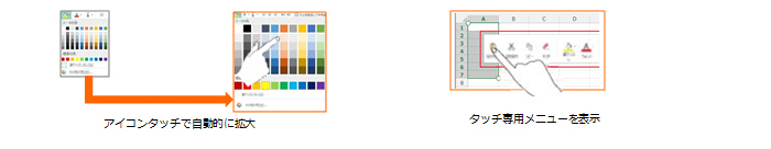 タッチ操作でカラーパレットを表示すると、自動的にサイズを拡大! また、ミニツールバーはアイコンサイズを拡大するだけでなく、タッチ専用でコマンドが追加され、より快適な入力操作が可能となります。