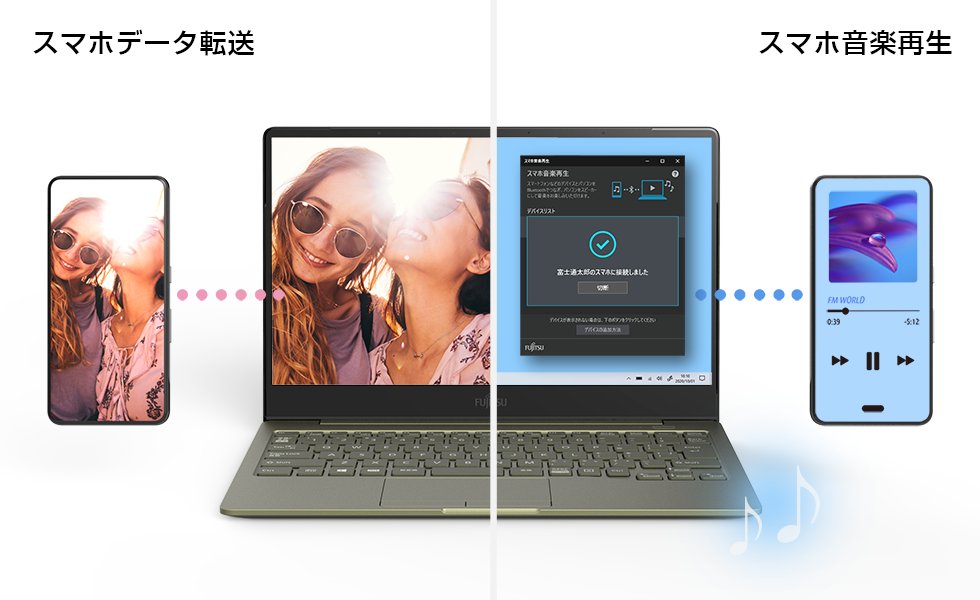 スマホとパソコンの間で写真やデータをかんたんに転送でき、美しい大画面に映し出せます。また、スマホで聞いていた音楽をBluetoothで飛ばして聞くことも可能。スピーカーから出る音は音響補正アプリDiracでチューニングしているので、パワフルなサウンドを楽しめます。