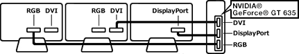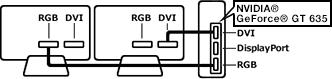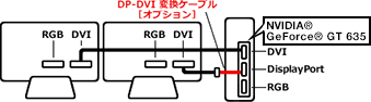 | グラフィック「NVIDIA® GeForce® GT 635」選択時 * 3台同時に表示出力する場合は、アナログRGBディスプレイ×1、DVI対応ディスプレイ×1、DisplayPort対応ディスプレイ×1またはアナログRGBディスプレイ、DVI対応ディスプレイ×2(DP-DVI変換ケーブル(オプション)が必要)をご使用ください。 * 「NVIDIA® GeForce® GT 635」はWD2/Mのみ選択できます。 |