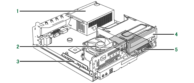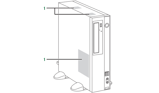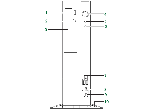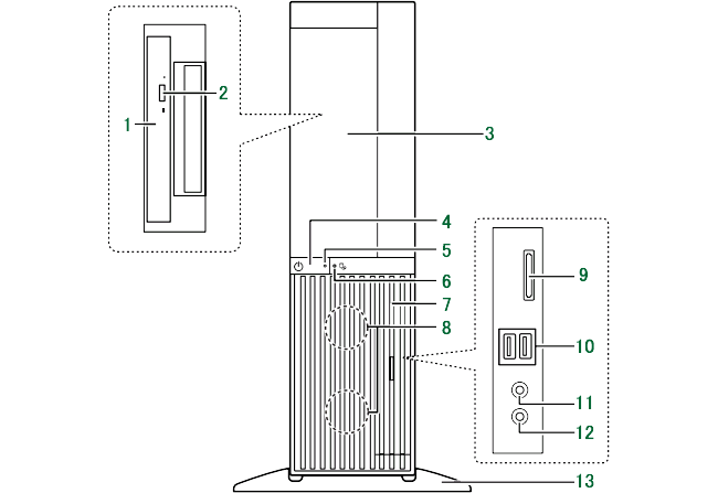 1. BDXL™ 対応 Blu-ray Discドライブ[注1]/スーパーマルチドライブ[注2] 2. CD/DVD取り出しボタン 3. フラップ 4. 電源ボタン(