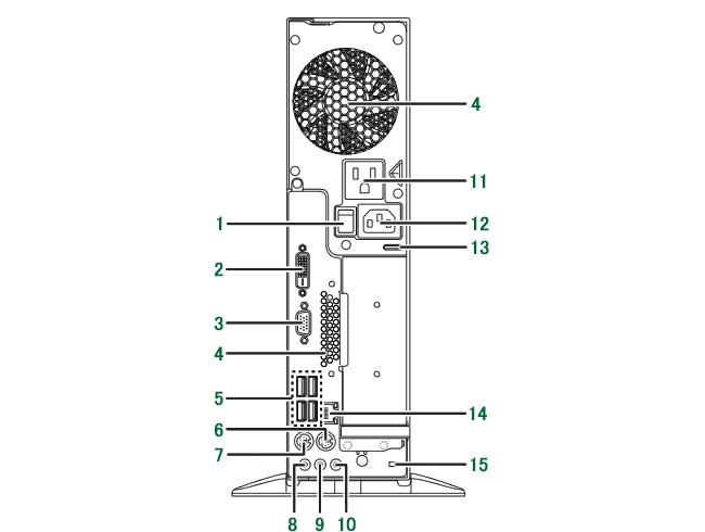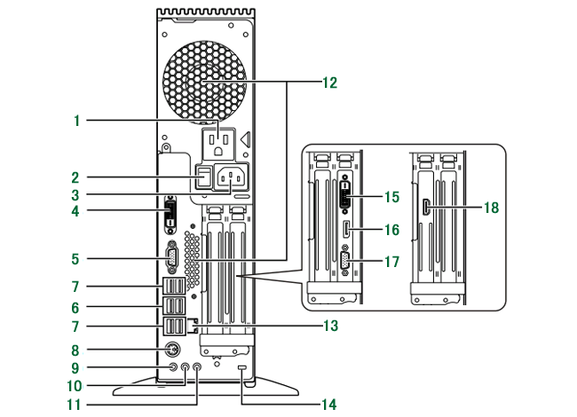 )14. 盗難防止用ロック取り付け穴 15. DVI-Dコネクタ(DVI)[注2] 16. DisplayPortコネクタ(DP)[注2] 17. アナログRGBコネクタ(VGA)[注2] 18. HDMI出力端子[注3] 注1 : NVIDIA® GeForce® GT 635 非搭載機種のみお使いになれます。 注2 : NVIDIA® GeForce® GT 635 搭載機種のみお使いになれます。NVIDIA® GeForce® GT 635 非搭載機種では、このコネクタは付いていません。 注3 : HDMIインターフェース搭載機種でお使いになれます。HDMIインターフェース非搭載機種では、このコネクタは付いていません。 -