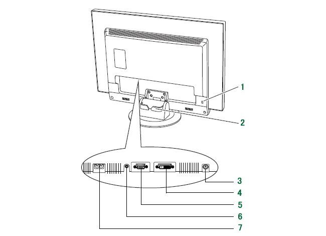 1. アウトレット 2. メインスイッチ 3. インレット 4. DVI-Dコネクタ(