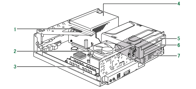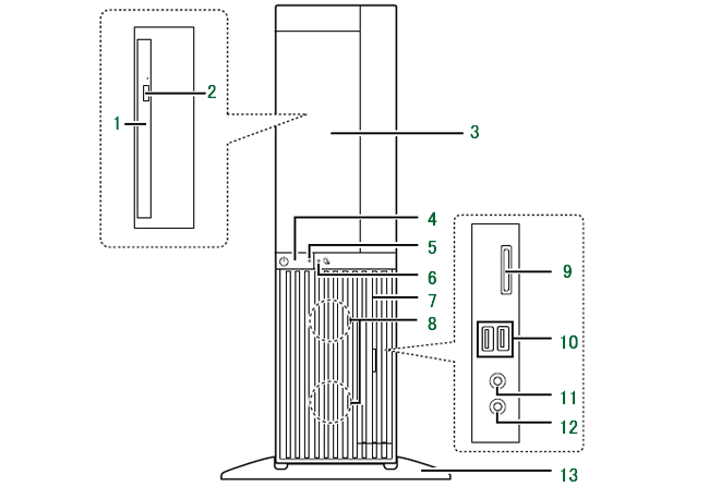 1. BDXL™ 対応 Blu-ray Discドライブ[注1]/スーパーマルチドライブ[注2] 2. CD/DVD取り出しボタン 3. フラップ 4. 電源ボタン(