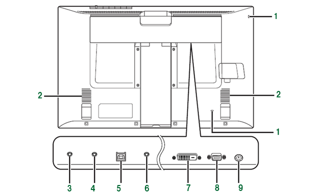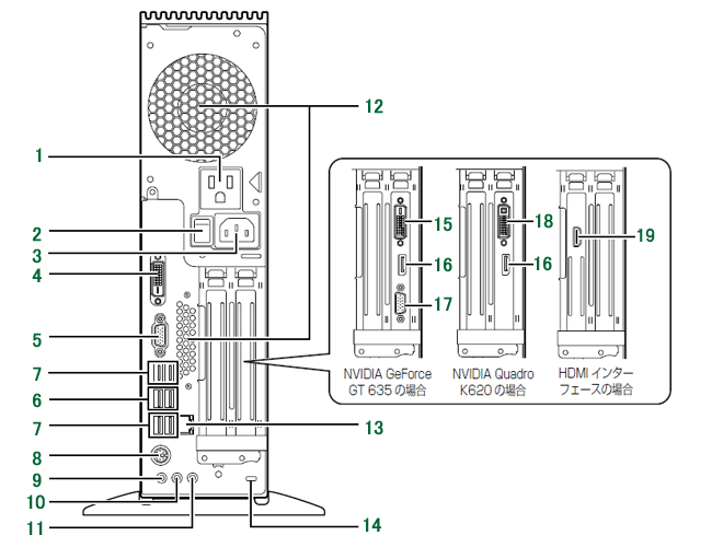 )14. 盗難防止用ロック取り付け穴 15. DVI-Dコネクタ(DVI)[注2] 16. DisplayPortコネクタ(DP)[注3] 17. アナログRGBコネクタ(VGA)[注2] 18. DVI-Iコネクタ(DVI)[注4] 19. HDMI出力端子(