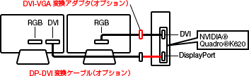 * アナログRGBディスプレイに表示する場合は、DVI-VGA変換アダプタ(オプション)が必要です。また、DVI対応ディスプレイを2台使用する場合はDP-DVI変換ケーブル(オプション)が必要です。