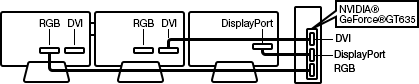 * 3台同時に表示出力する場合は、アナログRGBディスプレイ×1、DVI対応ディスプレイ×1、DisplayPort対応ディスプレイ×1またはアナログRGBディスプレイ、DVI対応ディスプレイ×2(DP-DVI変換ケーブル(オプション)が必要)をご使用ください。