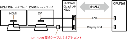 - 「NVIDIA® Quadro® K620」または「NVIDIA® GeForce® GTX 745」を搭載し、複数のディスプレイを接続した場合、Blu-rayディスク再生時には一方のディスプレイにのみ表示されます。Blu-rayディスク再生時の2画面同時表示は、後日アップデートプログラムの提供で対応予定です。