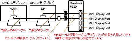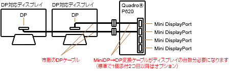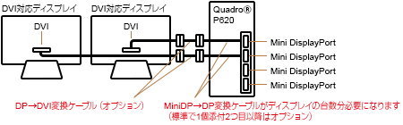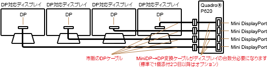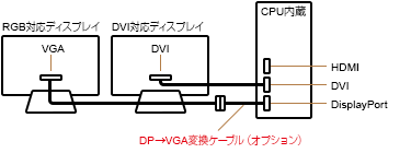 純正ディスプレイでマルチディスプレイ表示を行う場合は、「別売オプションのDP→DVI変換ケーブル」または市販のDPケーブルが必要になります。