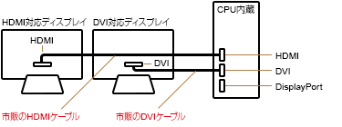 富士通純正ディスプレイ以外でマルチディスプレイ表示を行う場合は、市販のDPケーブルまたはHDMIケーブルを使ってディスプレイと接続が可能です。(ディスプレイによっては添付されている場合があります。)