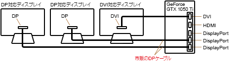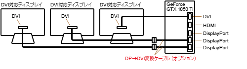 富士通純正ディスプレイでマルチディスプレイ表示を行う場合は、「別売オプションのDP-DVI変換ケーブル」または市販のDPケーブルが必要になります。