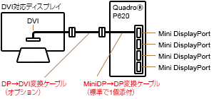 「NVIDIA Quadro® P620」選択時は別売オプションのDP→DVI変換ケーブルまたは市販のDPケーブルが別途必要になります。