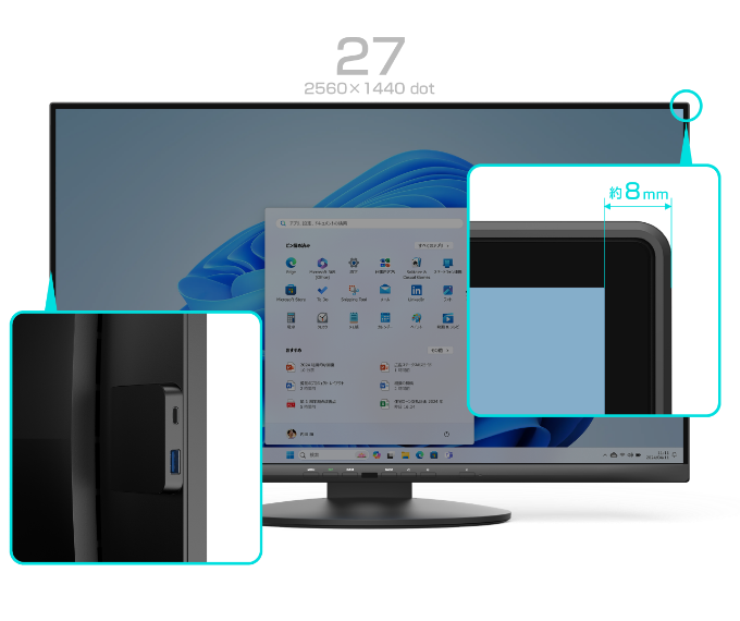 すっきりとした3辺狭額タイプの高精細な大型ディスプレイです。約8mmの超狭額ベゼルデザインにより、大画面で没入感のある映像を楽しめます。