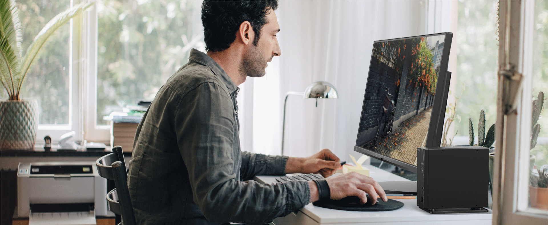 わずか幅51mm×奥行164.5mm×146.5mm(縦置き)のサイズ。タテにもヨコにも置けて、設置場所を選びません。ケーブルの無いワイヤレス・キーボード/マウス、無線LANを使って机上をよりすっきりさせることもでき、趣味やビジネスに毎日快適にお使いいただけます。