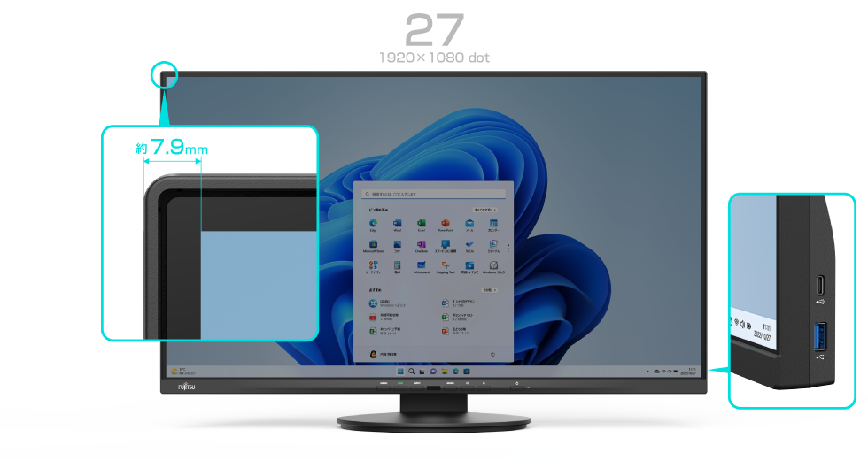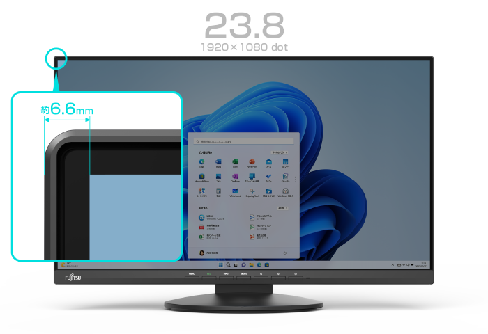 すっきりとした3辺狭額タイプの高精細な大型ディスプレイです。約8mmの超狭額ベゼルデザインにより、大画面で没入感のある映像を楽しめます。